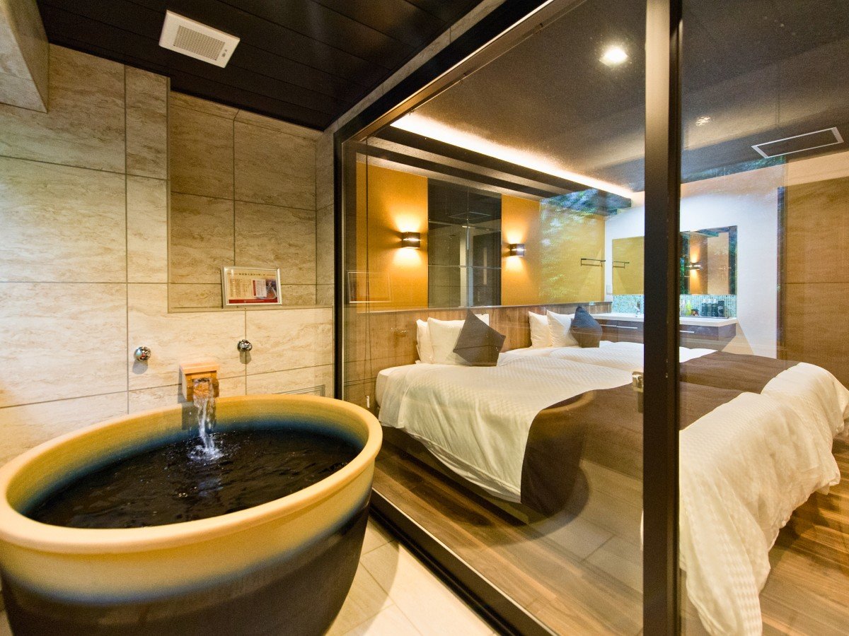 全室に信楽焼の半露天風呂を完備しているのも大きな魅力。陶器ならではのやわらかな質感と、ほどよく外の空気を感じられる造りで、プライベート感のある温泉時間を楽しめます。