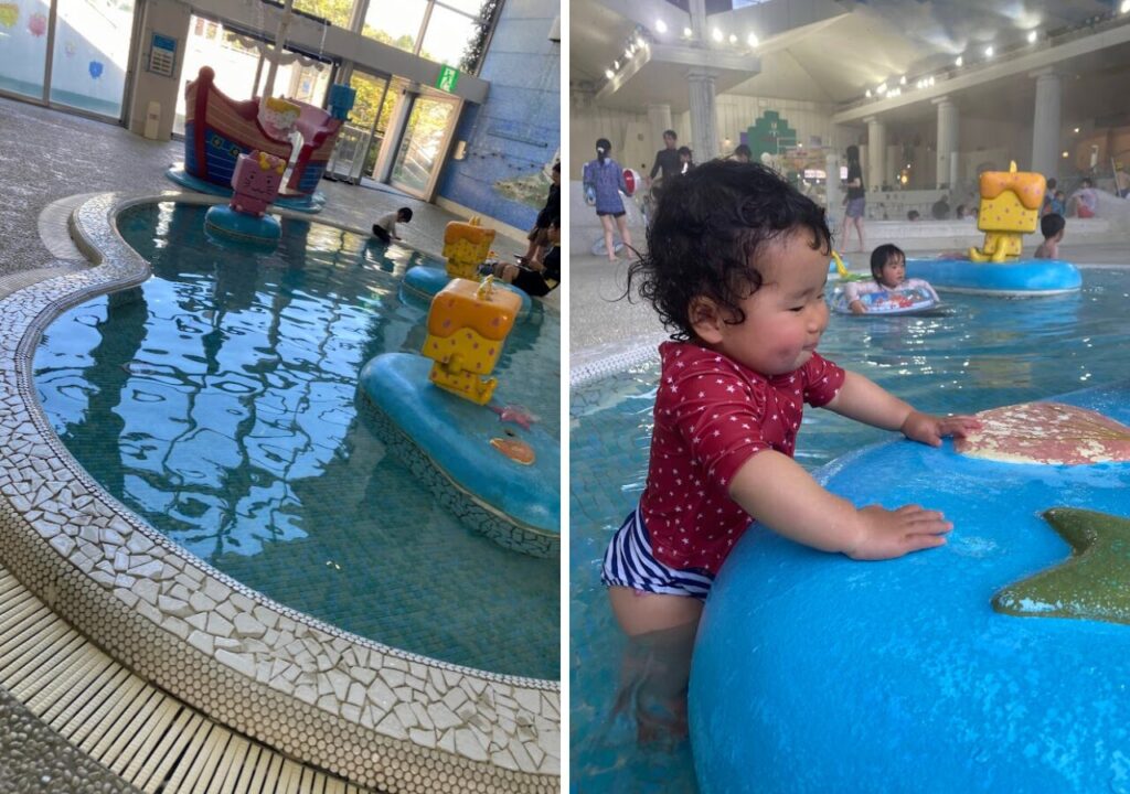 ユネッサンは温水なので、一般的なプールよりも体が冷えにくく、プールデビューにもぴったり実際に行くと、小さな赤ちゃん連れのファミリーもかなり多い印象です。