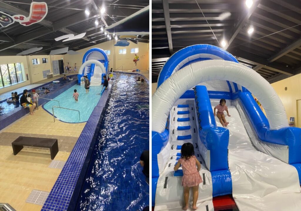 2023年夏に新設された流れるプールの真ん中にも子ども向けのすべり台があります。エアータイプなので転んでもいたくないものうれしいポイント。オムツの赤ちゃんも楽しそうにすべっていました。小学3年生まで利用できます!